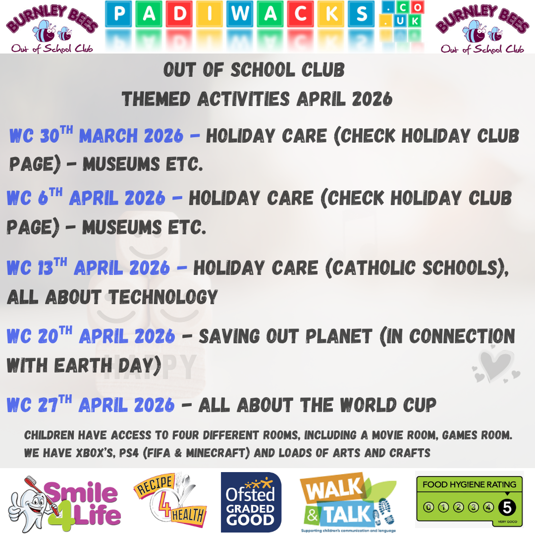 Our dedicated team work specifically in the Out of School Club and all the staff access up-to-date training, including safeguarding, behaviour and ACE's training. We've been providing childcare for 20 years in Padiham and Burnley. All our Out of School Team have up to date paediatric first aid training.