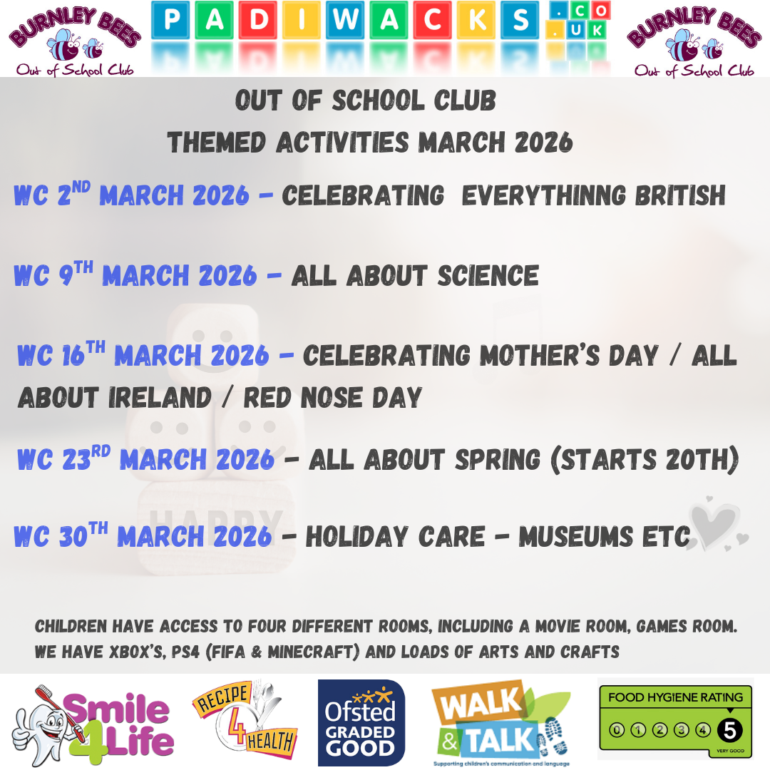 Our dedicated team work specifically in the Out of School Club and all the staff access up-to-date training, including safeguarding, behaviour and ACE's training. We've been providing childcare for 20 years in Padiham and Burnley. All our Out of School Team have up to date paediatric first aid training.